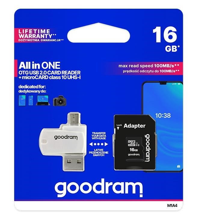 GOODRAM M1A4 All in One delivers versatility by providing functionality of few devices in one solution. It is a card reader equipped with USB 2.0 and micro USB connectors, allowing easy data transfer between computers, smartphones, tablets and cameras. It comes bundled with a fast UHS-I microCard.