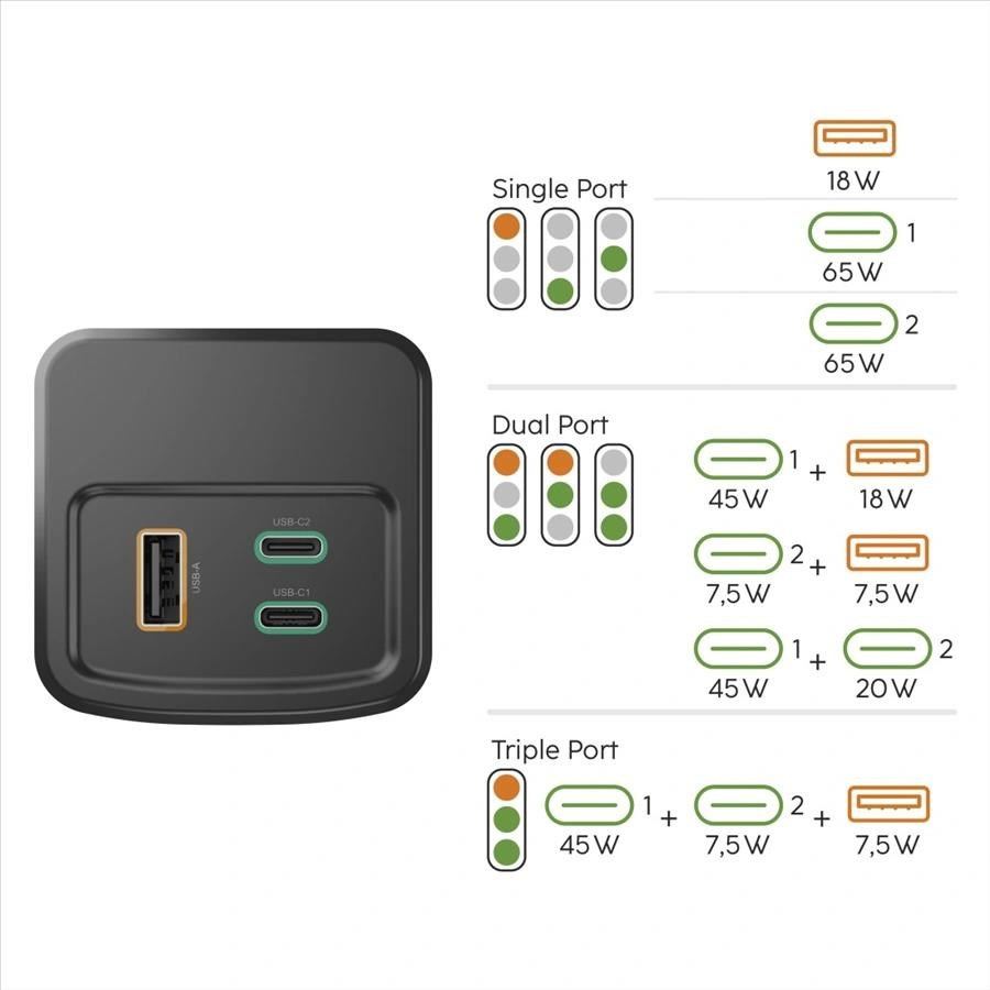 - možnost současného nabíjení 3 zařízení ze 2 USB-C zásuvek a 1 USB-A zásuvky