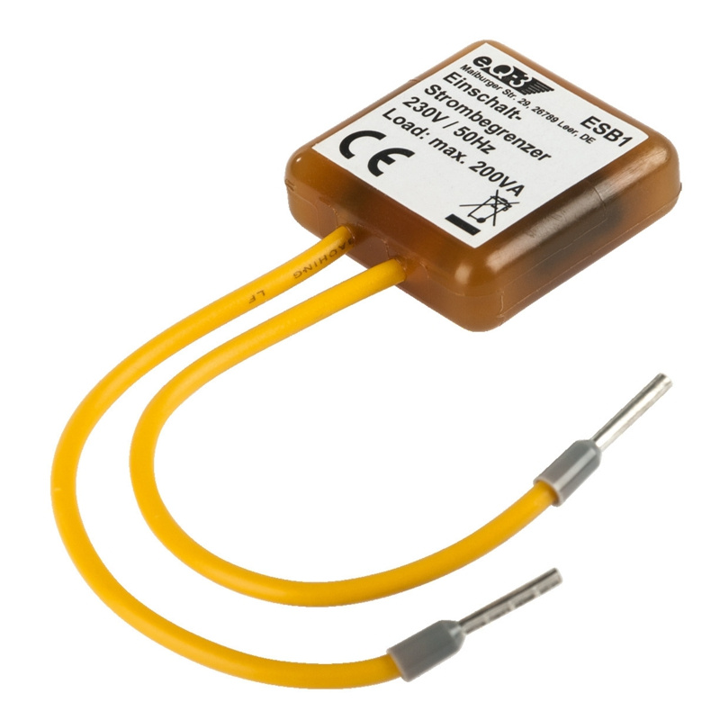 Kompenzátor náběhového proudu (ESB1) omezuje vysoké náběhové proudy pomocí integrovaného termistoru až do 90A/1ms (200VA), tím chrání kontakty akčních členů před předčasným opotřebením a současně prodlužuje životnost úsporných i klasických svítidel, spínačů a dalších elektrických zařízení.