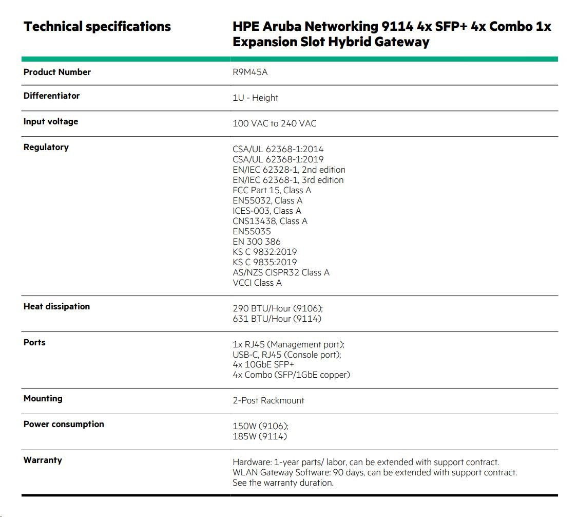 HPE Aruba Networking 9114 4x SFP+ 4x Combo 1x Expansion Slot Hybrid Gateway R9M45AR RENEW