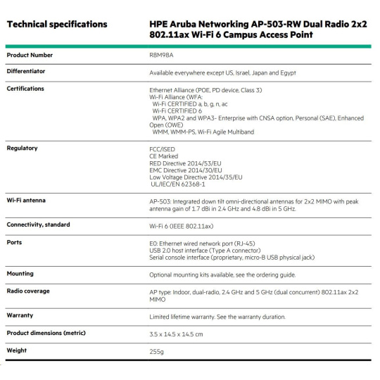 HPE Aruba Networking AP-503-RW Dual Radio 2x2:2 802.11ax Wi-Fi 6 Campus Access Point (Includes Mount Bracket) R8M98A REN