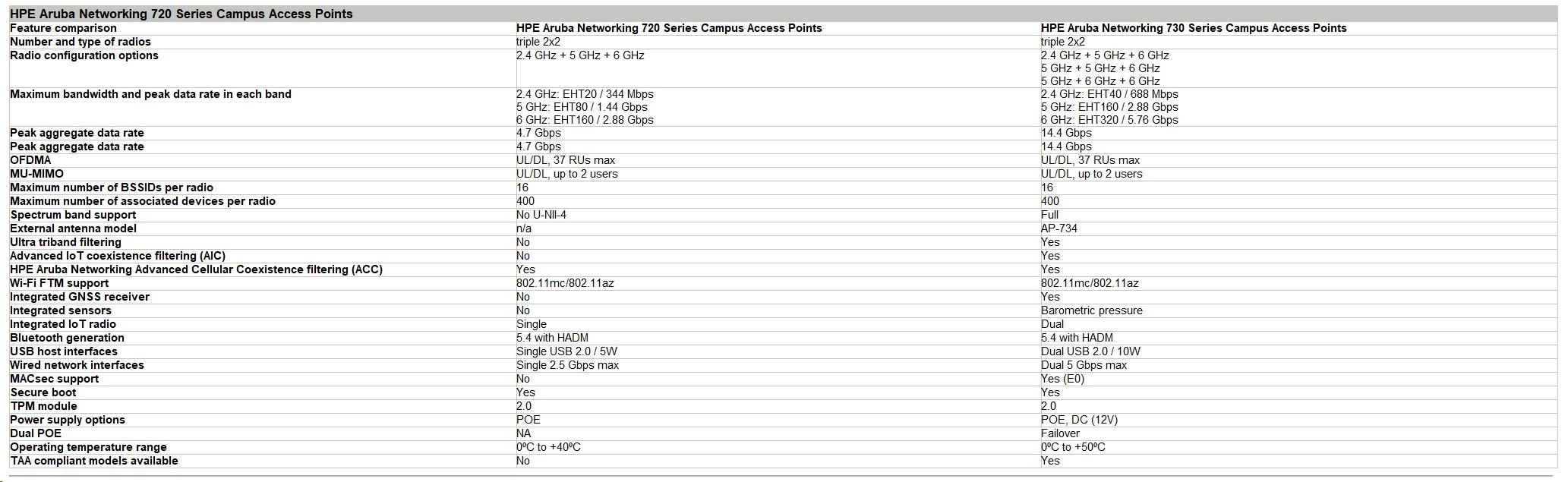 Leveraging AI-powered HPE Aruba Networking Central, the HPE Aruba Networking 720 Series Campus Access Points is an integral part of the HPE Aruba Networking Wi-Fi 7 access point portfolio. Built on the same high-performance Wi-Fi 7 platform as the HPE Aruba Networking 730 Series Campus Access Points, the HPE Aruba Networking 720 Series Campus Access Points offers a cost-effective solution by omitting high-end features such as 320 MHz channel bandwidth support, dual IoT radios, dual 10 Gbps ports, and MACsec support.