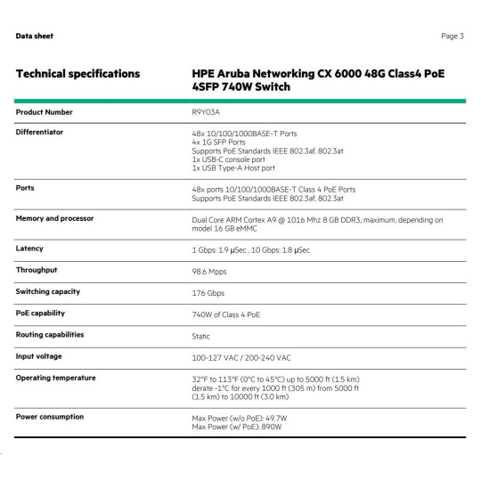 The HPE Aruba Networking CX 6000 Switch Series offers Ethernet gigabit connectivity and optional PoE to provide entry level, reliable, and convenient wired access connectivity for enterprise branch offices and SMB networks. Delivers a simple, consistent operator experience with the HPE Aruba Networking CX Switch Operating System (AOS-CX) used across HPE Aruba Networking CX switching platforms. Fully-managed enterprise vclass switches deliver Layer 2 capabilities with support static routing, ACLs, robust QoS, traffic prioritization, sFlow, and IPv6. Right size deployment with choice of 12, 24, and 48 port 1U models with convenient built-in 1 GbE uplinks and up to 740W of Class 4 PoE. Simplifies ownership with no switch software licensing or subscriptions required.