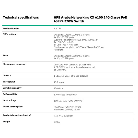 HPE Aruba Networking CX 6100 24G Class4 PoE4SFP+ 370W Switch