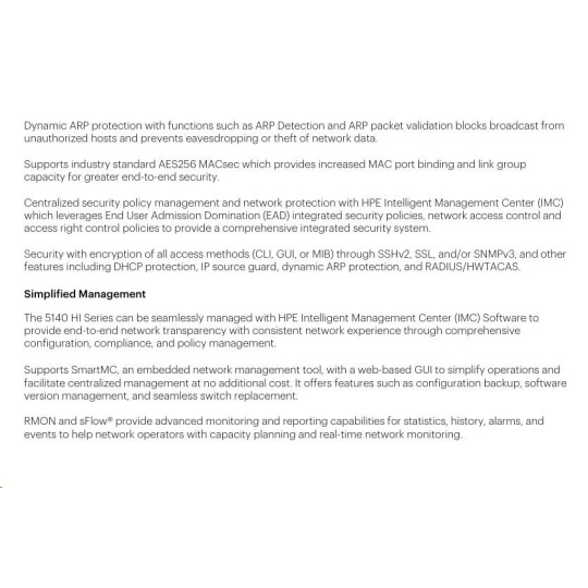 | Management | IMC-Intelligent Management Center; Smart MC, command-line interface; SNMP Manager | ||