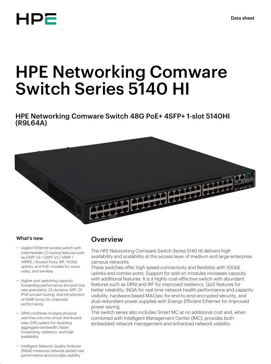HPE FlexNetwork 5140 48G PoE+ 4SFP+ HI Switch R9L64A RENEW