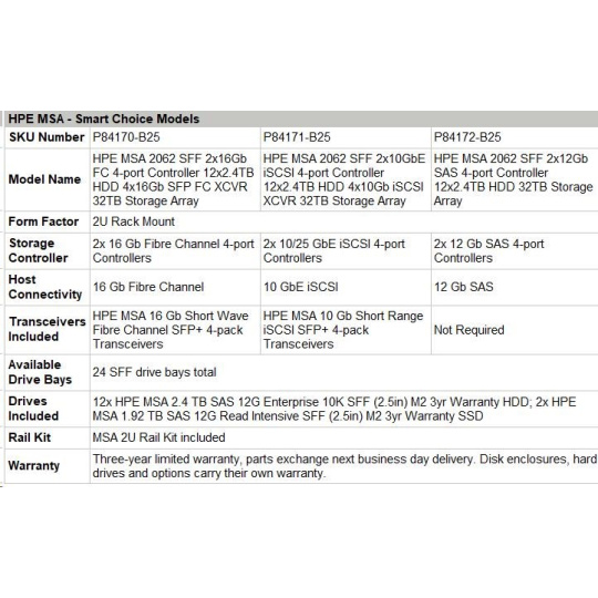 HPE MSA 2062 SFF 2x16Gb FC 4-port Controller 12x2.4TB HDD 4x16Gb SFP FC XCVR 32TB Storage Array Smart Choice.