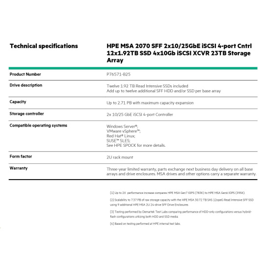 HPE MSA 2070 SFF 2x10/25GbE iSCSI 4-port Cntrl 12x1.92TB SSD 4x10Gb iSCSI XCVR 23TB Storage Array Smart Choice