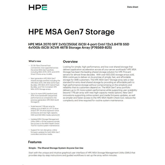 HPE MSA 2070 SFF 2x10/25GbE iSCSI 4-port Cntrl 12x3.84TB SSD 4x10Gb iSCSI XCVR 46TB Storage Array Smart Choice
