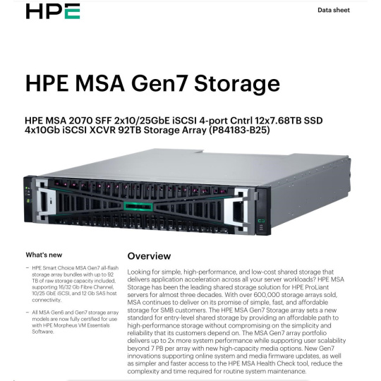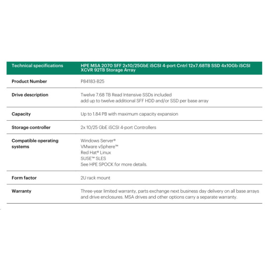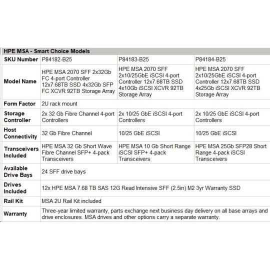 HPE MSA 2070 SFF 2x10/25GbE iSCSI 4-port Controller 12x7.68TB SSD 4x10Gb iSCSI XCVR 92TB Storage Array Smart Choice.