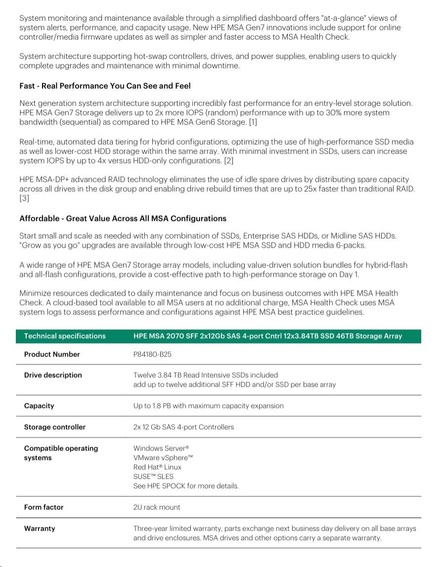 HPE MSA 2070 SFF 2x12Gb SAS 4-port Controller 12x3.84TB SSD 46TB Storage Array Smart Choice.