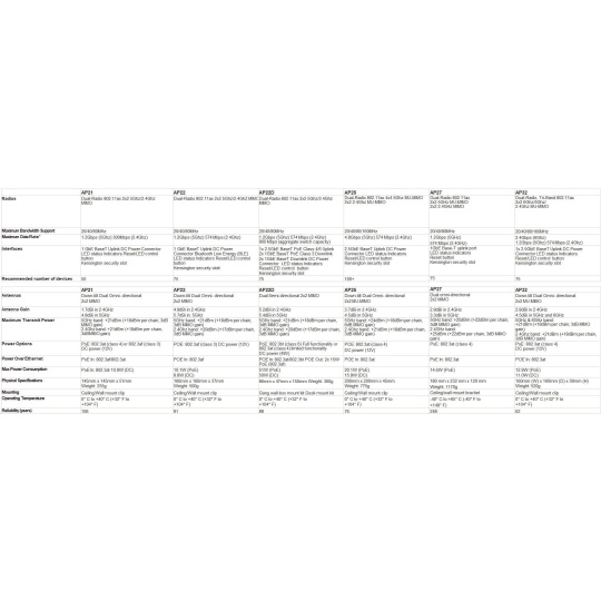 | Interfaces | 1 GbE BaseT Uplink DC Power Connector LED status Indicators Reset/LED control button Kensington security slot | 1 GbE BaseT Uplink DC Power Connector Bluetooth Low Energy (BLE) LED status Indicators Reset/LED control button Kensington security slott | 1x 2.5GbE BaseT PoE Class 4/6 Uplink 2x 1GbE BaseT PoE Class 3 Downlink 2x 1GbE BaseT Downlink DC Power Connector LED status Indicators Reset/LED control button Kensington security slot | 2.5GbE BaseT Uplink DC Power Connector LED status Indicators Reset/LED control button Kensington security slot | 1GbE Base-T uplink port LED status indicators Reset button Kensington security slot | 1x 2.5GbE BaseT Uplink DC Power Connector LED status Indicators Reset/LED control button Kensington security slot |