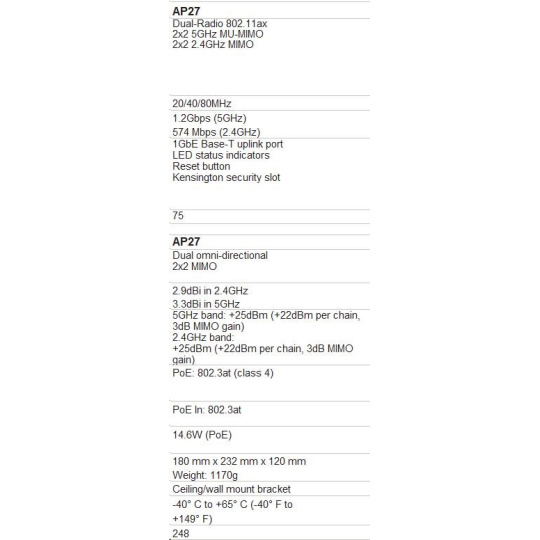 |   Interfaces  |    1 GbE BaseT Uplink DC Power Connector LED status Indicators Reset/LED control button Kensington security slot  |    1 GbE BaseT Uplink DC Power Connector Bluetooth Low Energy (BLE) LED status Indicators Reset/LED control button Kensington security slott  |    1x 2.5GbE BaseT PoE Class 4/6 Uplink 2x 1GbE BaseT PoE Class 3 Downlink 2x 1GbE BaseT Downlink DC Power Connector LED status Indicators Reset/LED control button Kensington security slot  |    2.5GbE BaseT Uplink DC Power Connector LED status Indicators Reset/LED control button Kensington security slot  |    1GbE Base-T uplink port LED status indicators Reset button Kensington security slot  |    1x 2.5GbE BaseT Uplink DC Power Connector LED status Indicators Reset/LED control button Kensington security slot  |