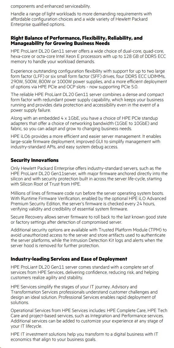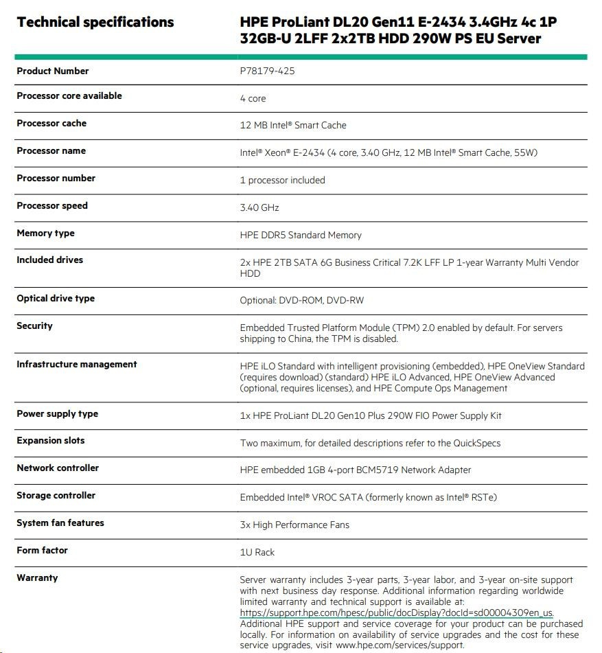 HPE PL DL20g11 E-2434 (3.4G/4C) 1x32G (P64339) 2x2TB/7.2k SATA VROC 2LFF-HP 4x1Gb 290W Smart Choice