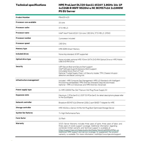 HPE PL DL320g11 6526Y (2.8/16C) 4x32G (p64706) 8SFF NS204(2x480G) 2x1000W 2p10GT 7F Smart Choice.