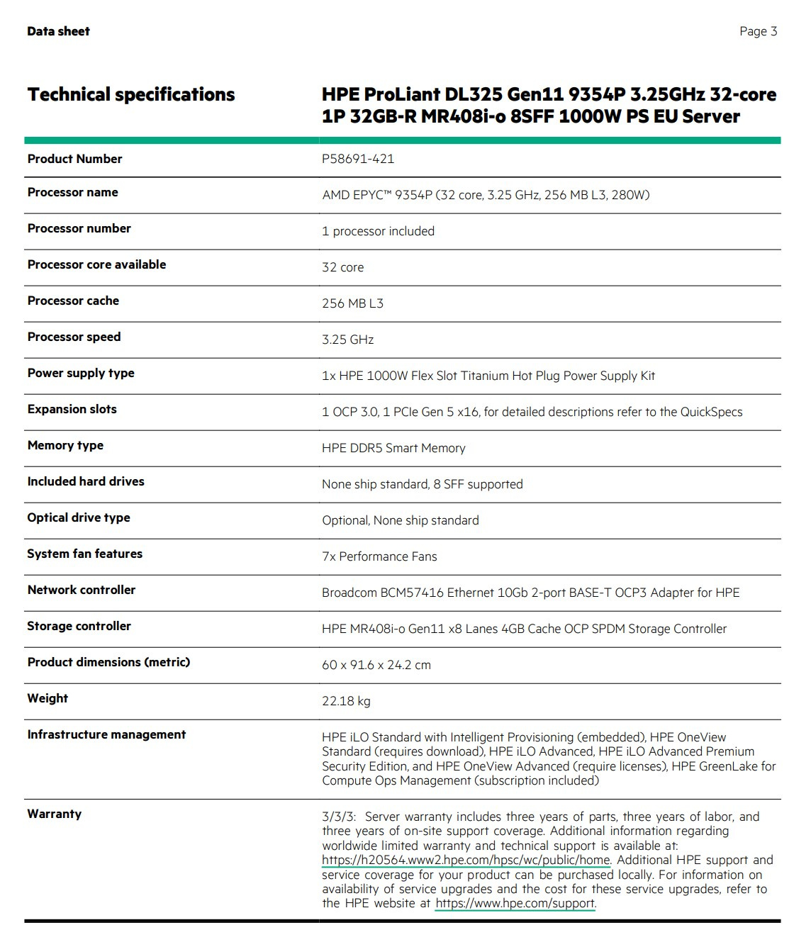 3/3/3: Server warranty includes three years of parts, three years of labor, and three years of on-site support coverage. Additional information regarding worldwide limited warranty and technical support is available at: https://h20564.www2.hpe.com/hpsc/wc/public/home. Additional HPE support and service coverage for your product can be purchased locally. For information on availability of service upgrades and the cost for these service upgrades, refer to the HPE website at https://www.hpe.com/support.