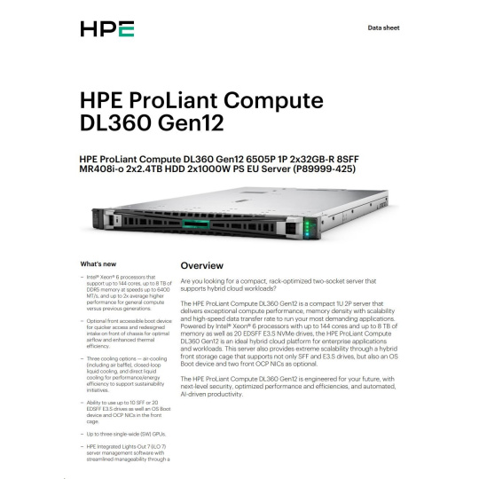 HPE PL DL360g12 6505P (2.2G/12C) 2x32G (P69727) 2x2.4TB MR408i-o 8SFF 2x1000W 2p10GbE NBD333 Smart Choice