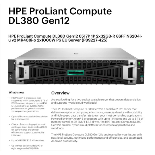 HPE PL DL380 Gen12 6517P (3.2/16C) 2x32G (P69727) NS204(2x480) MR408i-o 8SFF 2x1000W 10GbE NBD333 Smart Choice