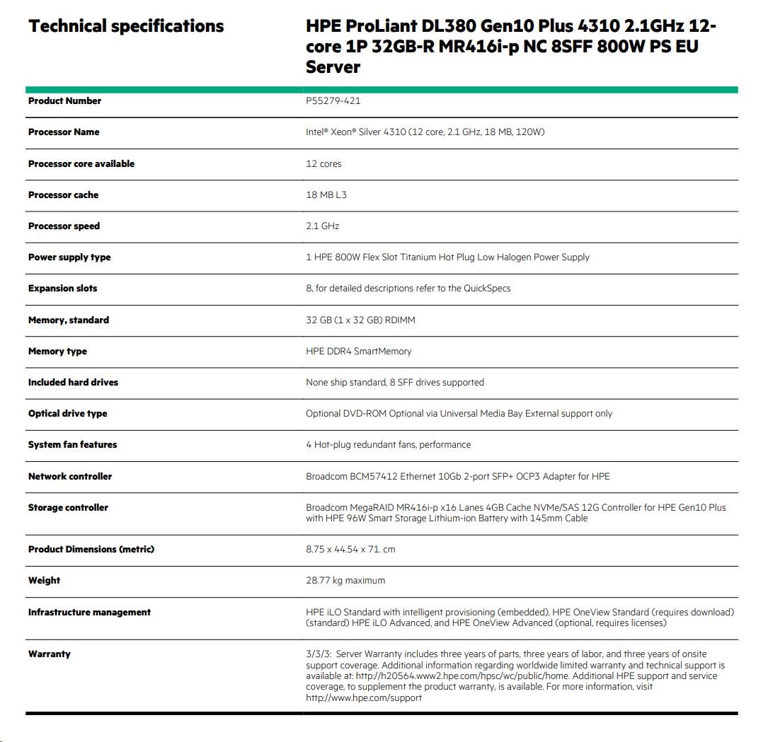 HPE ProLiant DL380 Gen10 Plus 4310 2.1GHz 12-core 1P 32GB-R MR416i-p NC 8SFF 800W PS EU Server