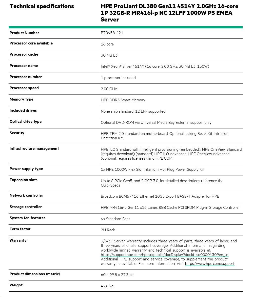 HPE PL DL380g11 4514Y (2.0/16C) 32G (p64706) MR416i-p/8G 12LFF 1000W 2x10G-T NBD333 2U