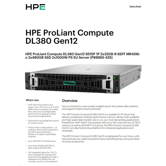 HPE PL DL380g12 6515P (2.4/16C) 2x32G (P69727) 2x480G MR408i-o 8SFF 2x1000W 2p10G-T NBD333 Smart Choice.