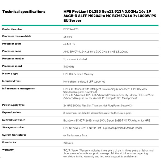 | Model Name | HPE PL DL385g11 9124 (3.0-3.7G/16C) 2x32G NS204i(2x480) 2x100W 8LFF 4x1G Smart Choice |
