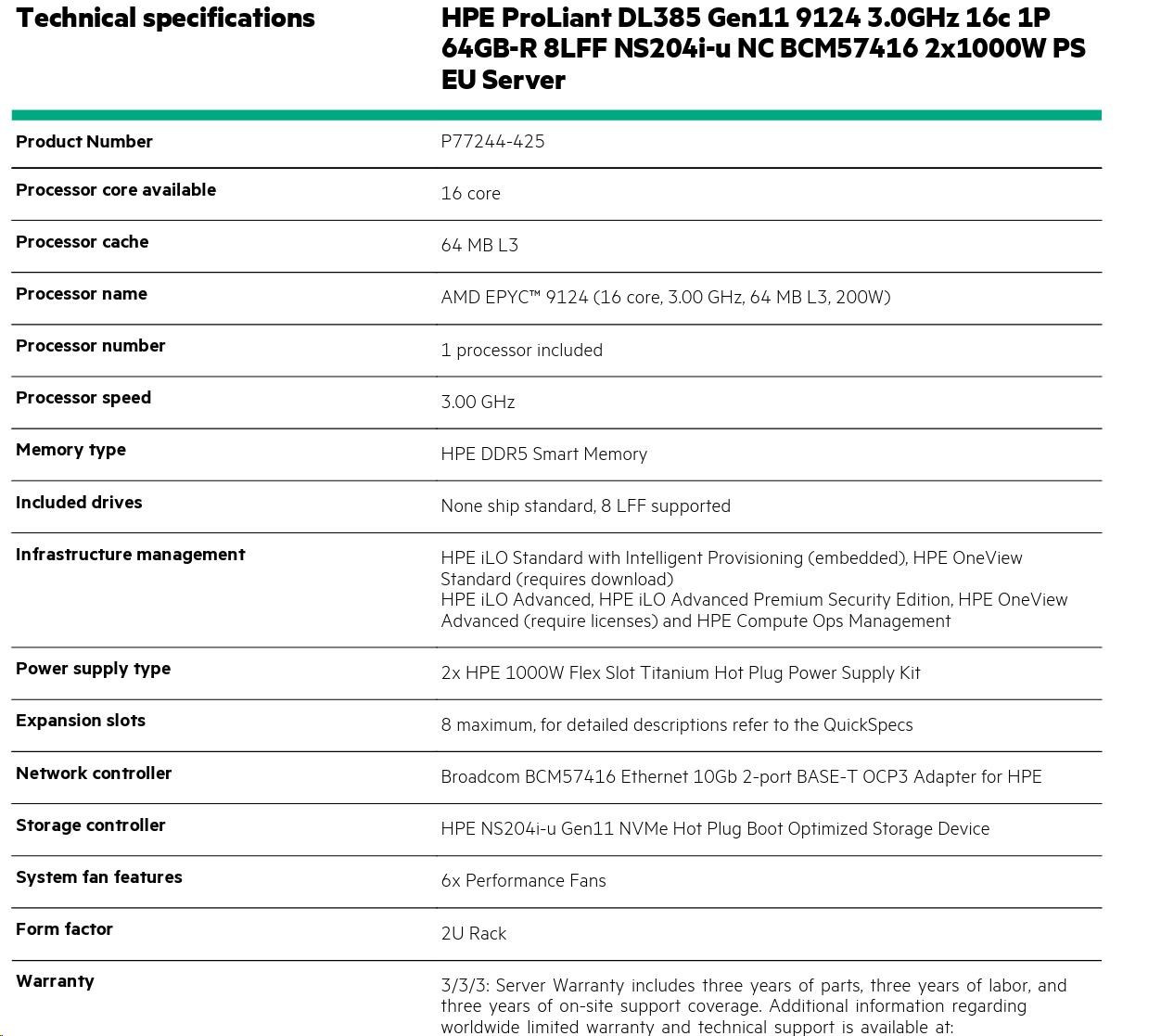 | Model Name | HPE PL DL385g11 9124 (3.0-3.7G/16C) 2x32G NS204i(2x480) 2x100W 8LFF 4x1G Smart Choice |