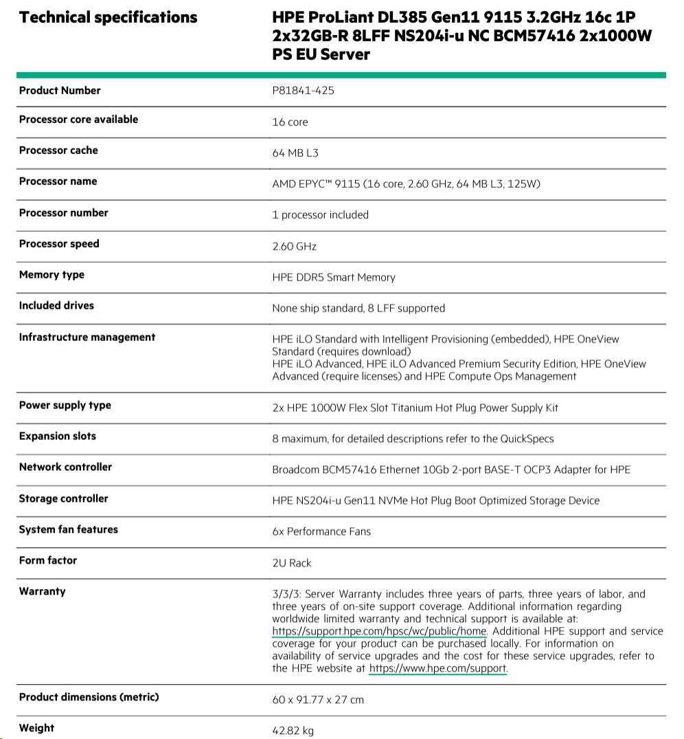Technical specifications HPE ProLiant DL385 Gen11 9015 2.6GHz 8c 1P 2x32GB-R 8LFF HPE MR408i-o 2p10Tocp 2x1000W PS EU