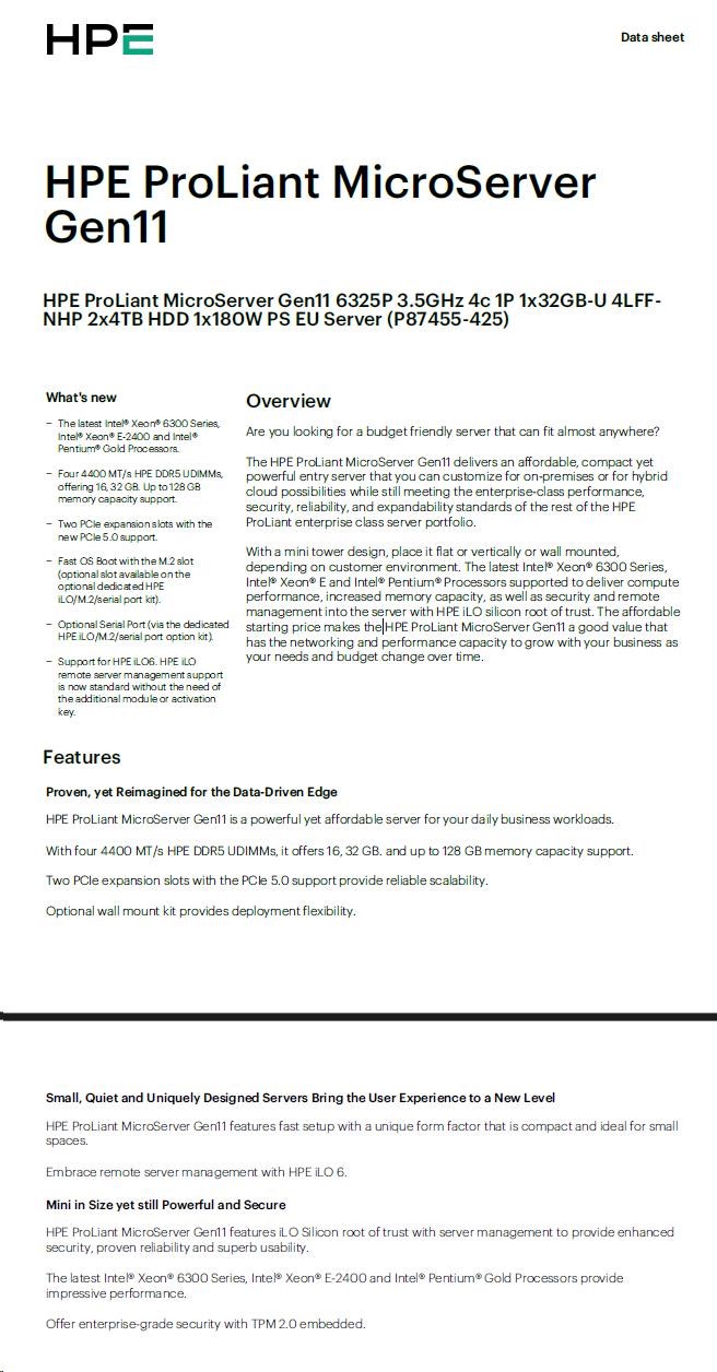 HPE PL MicroServer Gen11 6325P (3.5/4C) 1x32G 2x4TB SATA 4LFF/SFF-NHP VROC 4p1G NBD111 Smart Choice.