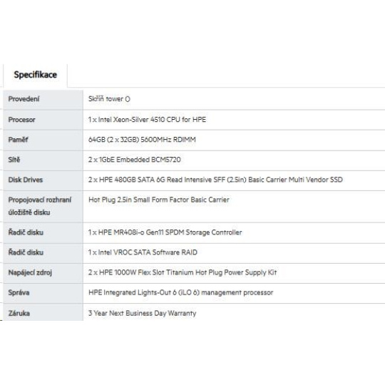 | Model Name | HPE ProLiant ML110 Gen11 4510 12-core 1P 64GB-R MR408i-o 8SFF 2x480GB SSD 2x1000W RPS EU Server |