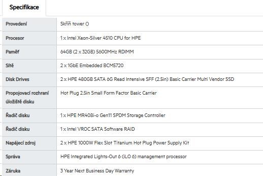 | Model Name | HPE ProLiant ML110 Gen11 4510 12-core 1P 64GB-R MR408i-o 8SFF 2x480GB SSD 2x1000W RPS EU Server |