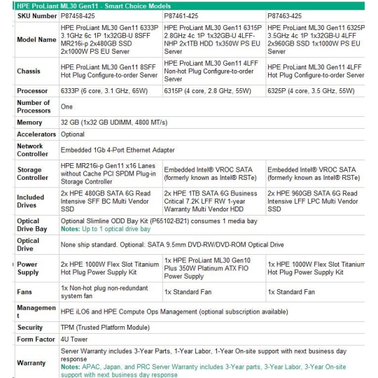 HPE PL ML30g11 6315P (2.8-5.2G/4C4T) 1x32G 2x1TB SATA 4LFF-NHP 1x350 VROC 4p1G NBD311 Smart Choice