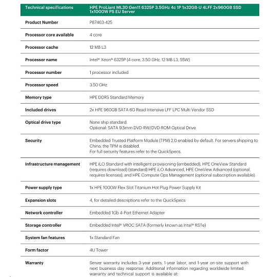 HPE PL ML30g11 6325P (3.5G/4C8T) 1x32G 2x960G SSD SATA 4LFF-HP VROC 1x1000W 4p1G NBD311 Smart Choice