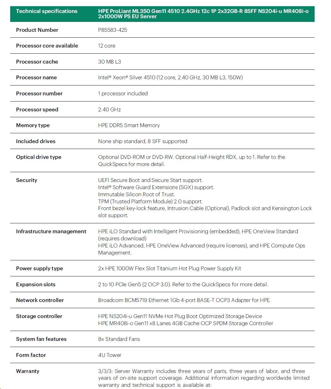 HPE PL ML350g11 4510 (2.4G/12C) 2x32G (P64706) NS204(2x480) MR408i-o 2x1000W 8SFF 4p1Gb Smart Choice.