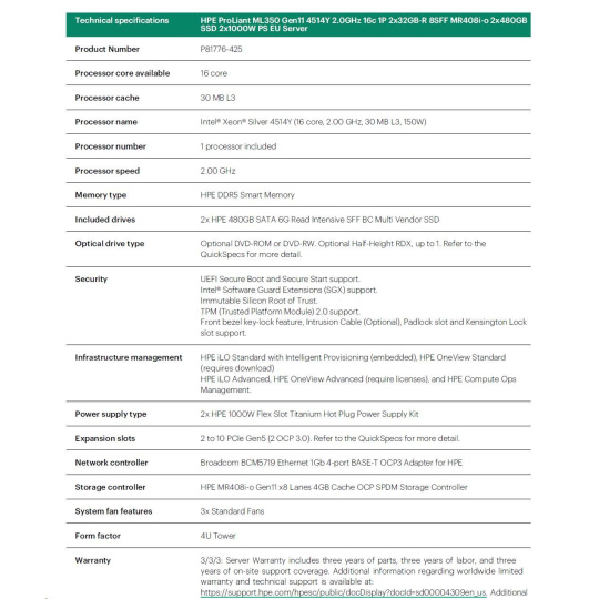 HPE ProLiant ML350 Gen11 4514Y 2.0GHz 16c 1P 2x32GB-R 8SFF MR408i-o 2x480GB SSD 2x1000W PS EU Server