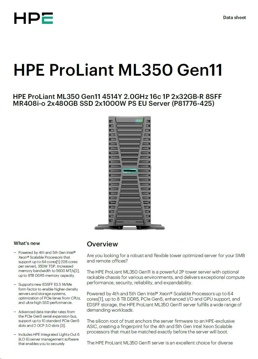 HPE ProLiant ML350 Gen11 4514Y 2.0GHz 16c 1P 2x32GB-R 8SFF MR408i-o 2x480GB SSD 2x1000W PS EU Server