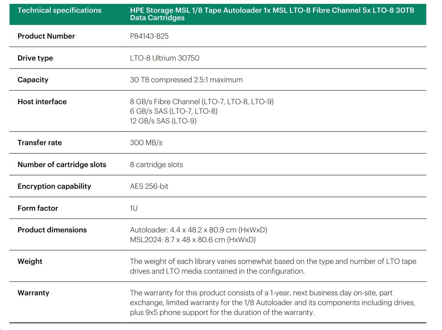 HPE Storage MSL 1/8 Tape Autoloader 1x MSL LTO-8 Fibre Channel 5x LTO-8 30TB Data Cartridges.