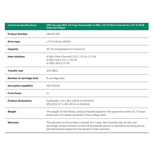 HPE Storage MSL 1/8 Tape Autoloader 1x MSL LTO-9 Fibre Channel 5x LTO-9 45TB Data Cartridges