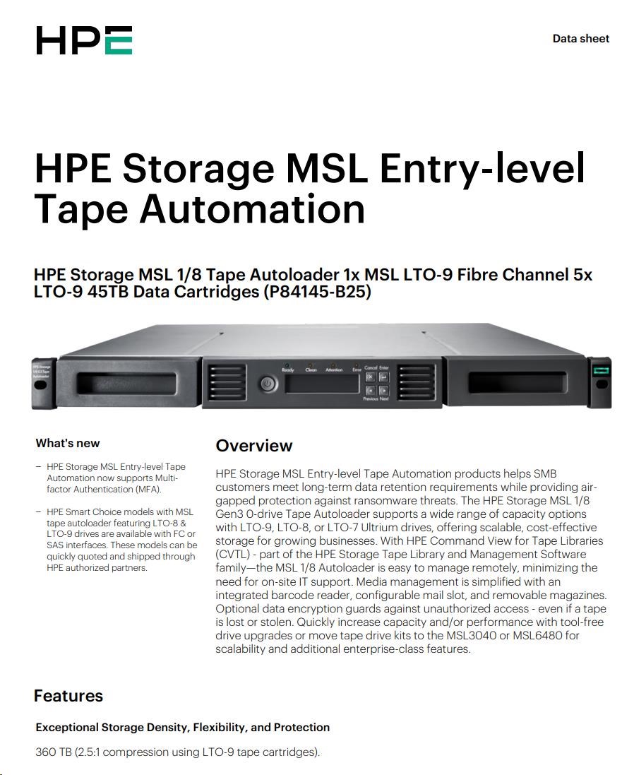 HPE Storage MSL 1/8 Tape Autoloader 1x MSL LTO-9 Fibre Channel 5x LTO-9 45TB Data Cartridges.