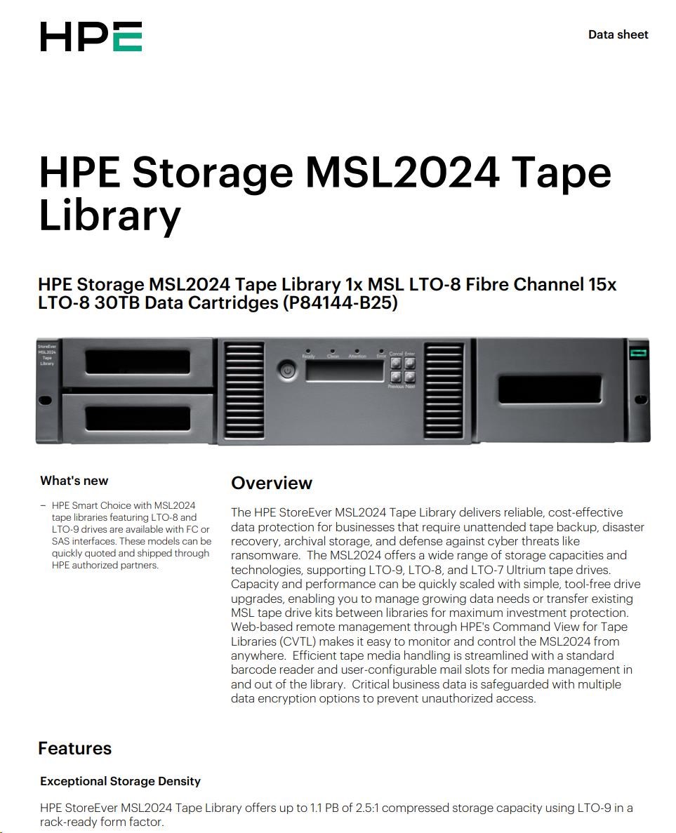 HPE Storage MSL2024 Tape Library 1x MSL LTO-8 Fibre Channel 15x LTO-8 30TB Data Cartridges
