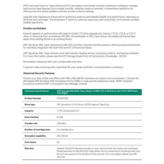 HPE Storage MSL2024 Tape Library (MSL LTO8 SAS Drive + 15x Q2078A LTO8 30TB Data Cartridges + Q2015A BarCodeLabelPack)