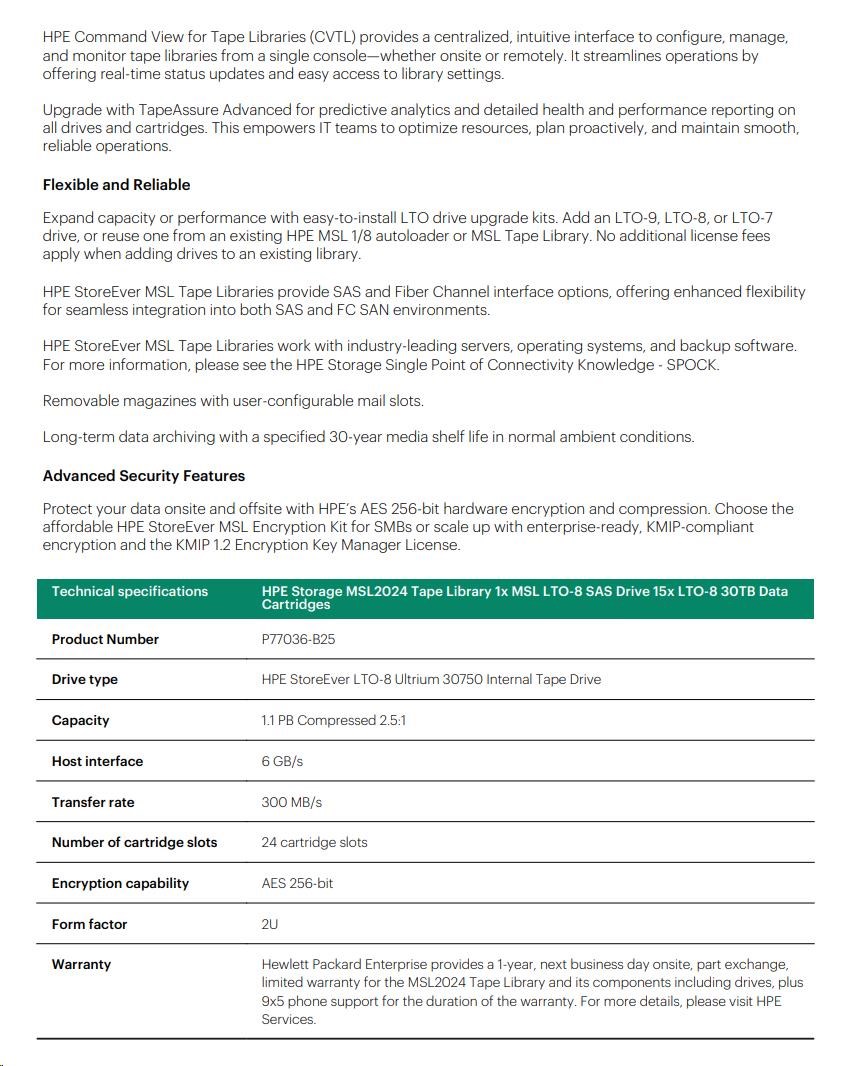 HPE Storage MSL2024 Tape Library 1x MSL LTO-8 SAS Drive 15x LTO-8 30TB Data Cartridges.