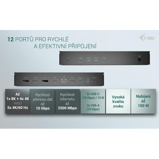 Dokovací stanice s nejvyšším možným výkonem! Podporuje až pět externích monitorů* s rozlišením 4K/60 Hz. A jeden monitor může dokonce běžet v rozlišení 8K/60Hz! Ideální dock produkt pro uživatele, kteří vyžadují více monitorů, aniž by museli dělat kompromisy v oblasti stability obrazu, rozlišení a obnovovací frekvence. Dokovací stanice je také vybavena dvěma porty pro rychlé nabíjení USB-C (s nabíjecím výkonem až 15 W), zejména pro nabíjení smartphonů a tabletů, dále pak rychlými porty USB, portem LAN 2,5 Gbps, jakož i dalšími periferiemi.