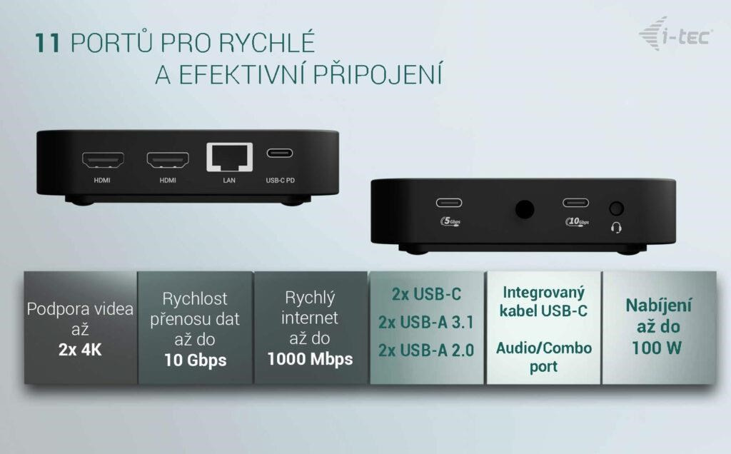 Moderní USB-C dokovací stanice pro kancelářské použití s podporou až dvou externích monitorů v rozlišení 4K. Stanice je kompatibilní s jakýmkoli notebookem vybaveným portem USB-C, USB4 nebo Thunderbolt 3/4/5. Nabízí 6 USB portů, spolehlivé a rychlé připojení k firemní síti díky integrovanému LAN portu a možnost instalace za monitor, což z ní dělá ideálního partnera pro profesionální použití. Samozřejmostí je také schopnost nabíjení notebooku nebo tabletu výkonem až 100 W.