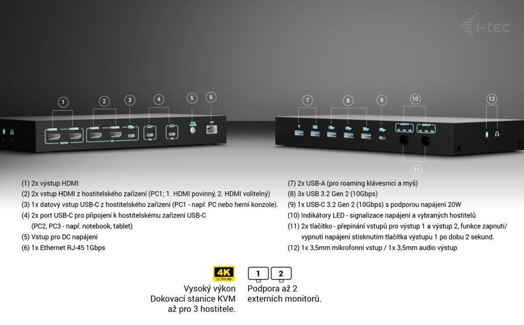 - Stanice podporuje připojení až dvou externích monitorů, které mohou zobrazovat buď obsah z jednoho hostitele, nebo každý z jiného – ideální pro paralelní práci nebo prezentace.