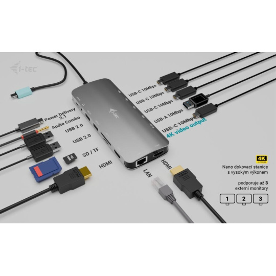 - Malá, ale výkonná kovová dokovací stanice USB-C, ke které lze připojit až tři externí monitory