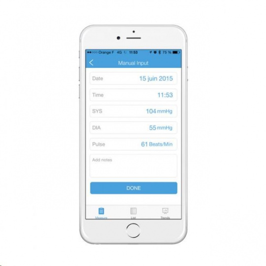 iHealth Track ale můžete bezdrátově a během vteřiny sesynchronizovat přes Bluetooth 4.0 s aplikací iHealth MyVitals ve svém chytrém telefonu a potažmo cloudu výrobce. Aplikace záznamenává neomezenou historii a umožňuje výsledky sdílet s rodinou či lékařem.