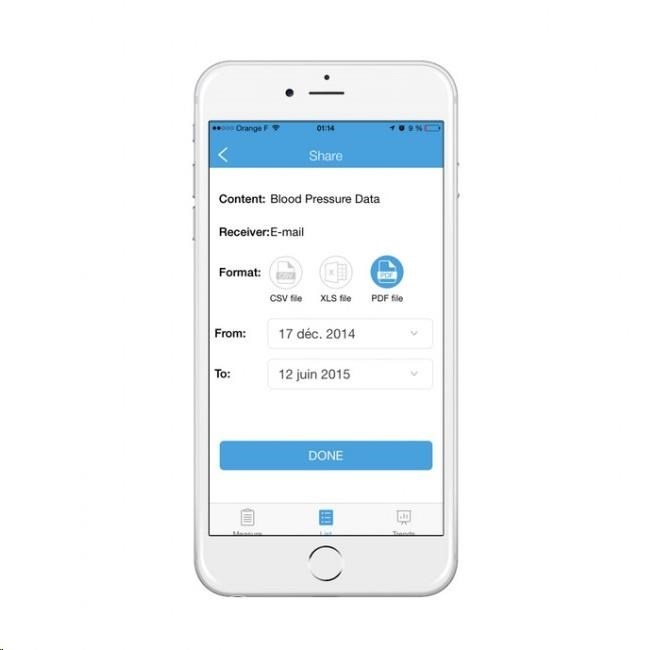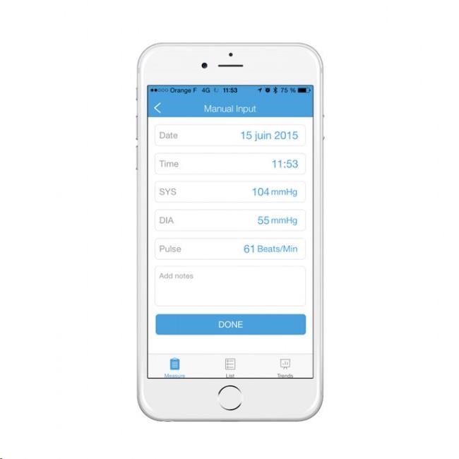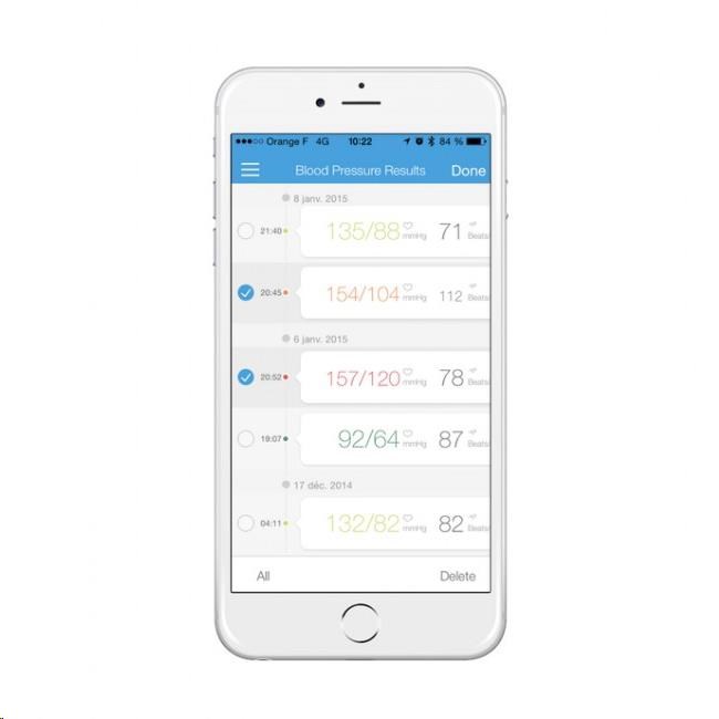iHealth Track ale můžete bezdrátově a během vteřiny sesynchronizovat přes Bluetooth 4.0 s aplikací iHealth MyVitals ve svém chytrém telefonu a potažmo cloudu výrobce. Aplikace záznamenává neomezenou historii a umožňuje výsledky sdílet s rodinou či lékařem.