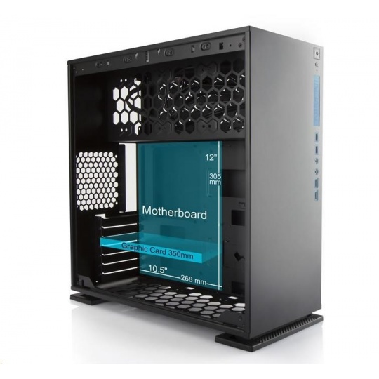 - Vevnitř je prostor pro grafickou kartu až do délky 350mm a CPU chladič až do velikosti 160 mm.