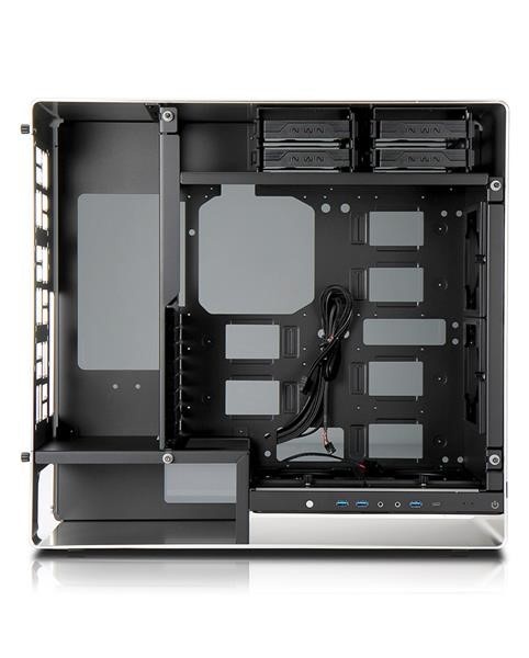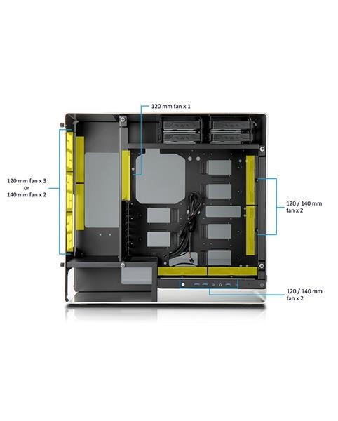 Oddělené pozice HDD a PSU zajišťují ideální proudění vzduchu skrz skříň ven zadními větracími otvory, aniž by se odvod teplého vzduchu brzdil o základní desky nebo grafické karty.